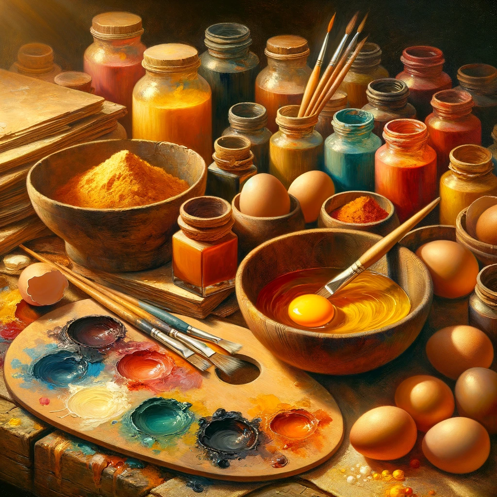 Traditionele tempera schildermaterialen bevatten geheimzinnige pigmenten vermengd met een betoverend bindmiddel zoals eigeel of eiwit.