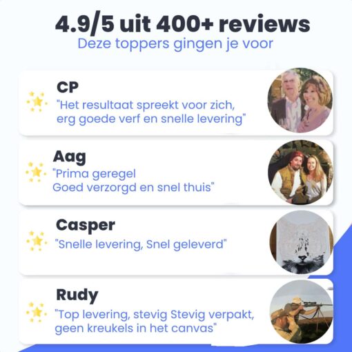 Heb je specifieke vragen over een schilderij of ben je op zoek naar meer algemene informatie? Onze klantenservice staat klaar om je met enthousiasme te helpen. Vergeet niet dat de werkelijke kleuren van het product licht kunnen afwijken van de afbeeldingen.